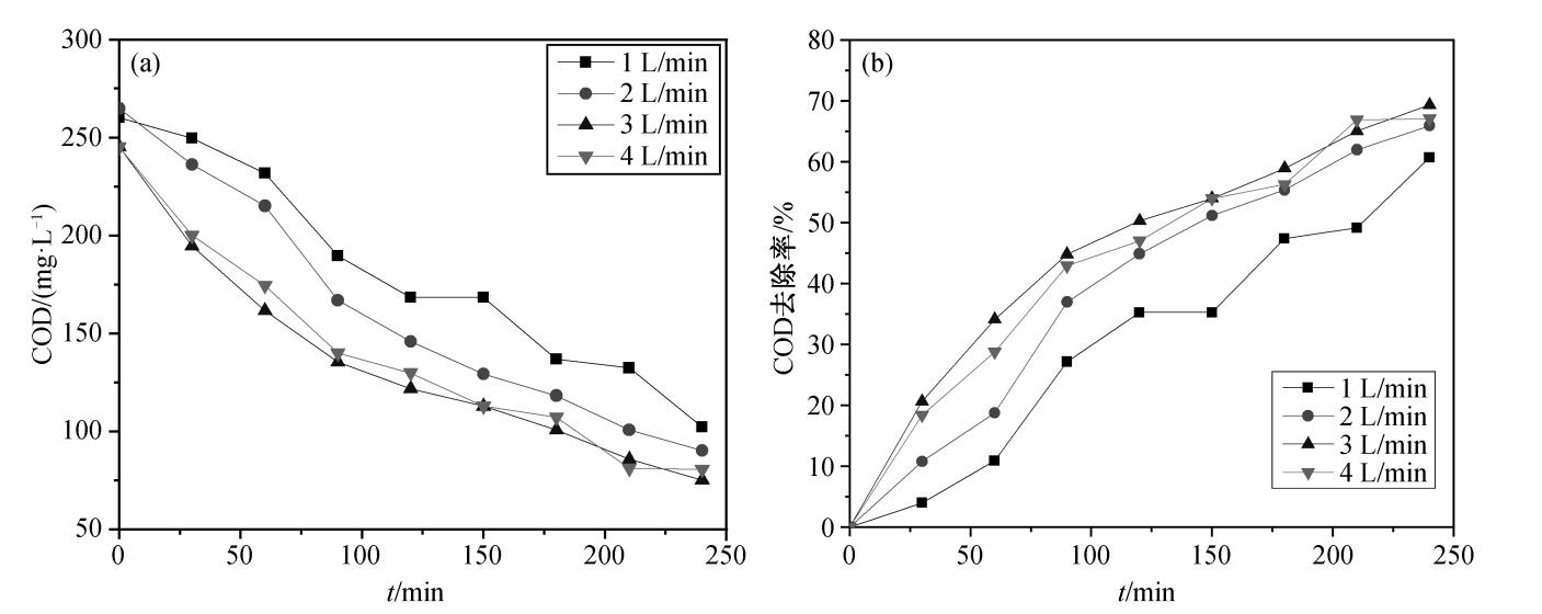 在催化劑投加量為 30%, 初始 pH 為 7 的條件下, 設(shè)置臭氧氣體流量分別為 1, 2, 3和 4 L/min, 探討臭氧氣體流量對催化臭氧化降解效果的影響, 實(shí)驗(yàn)結(jié)果如圖 所示。