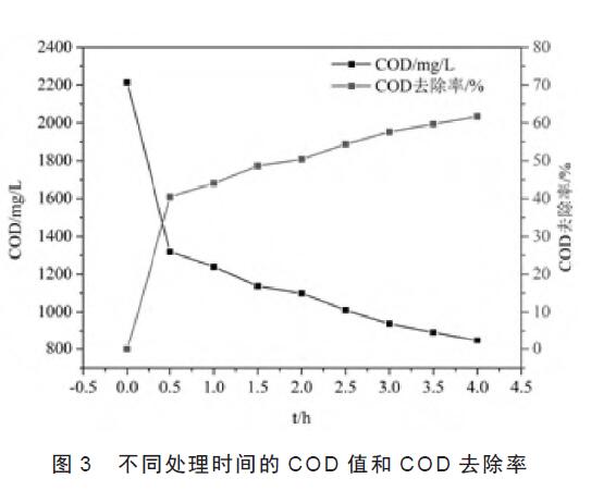 利用臭氧氧化技術處理該印染廢水,其結果見圖2。從圖2 中可以看出,隨著氧化時間的延長,COD 值逐漸減小。第1 h 時,COD 的去除率達到29.43%,到第4 h 時,COD 的去除率為40.98%,對應的COD 值為1 308 mg/L,表明臭氧氧化法該印染廢水中的COD 的去除具有一定的效果,分析原因是堿性條件下,臭氧分解快,羥基自由基氧化作用大,COD 的去除率增加。
