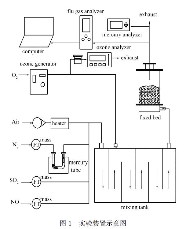 實驗系統(tǒng)示意圖見圖1,主要由配氣系統(tǒng)、氣體混合罐、吸附床和檢測系統(tǒng)組成。配氣系統(tǒng):空壓機壓縮鼓出的空氣通過轉子流量計控制,使用管式爐進行預熱調溫,使用質量流量控制器控制N2、NO 和SO2 氣體,其中,N2 氣體用于吹脫汞管中汞蒸氣。使用溫度測試儀測定煙氣溫度。O2與臭氧發(fā)生器相連,產生一定濃度的臭氧氣體,通過其自帶的流量計控制流量并注入混合罐中與煙氣混合。