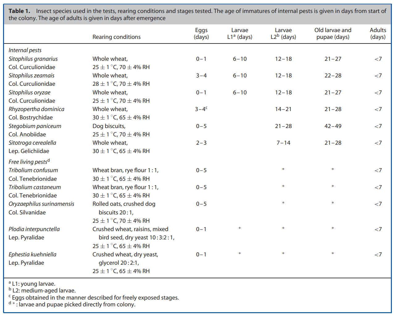 暴露于臭氧后,測試標(biāo)本在菌落維持條件下孵育(表1)。每天觀察自由暴露階段,7天中至少有5天,很多7天,或直到所有處理過的昆蟲死亡。有內(nèi)部階段的容器被保存,直到未經(jīng)處理的對照組的標(biāo)本作為成蟲出現(xiàn),至少3周。