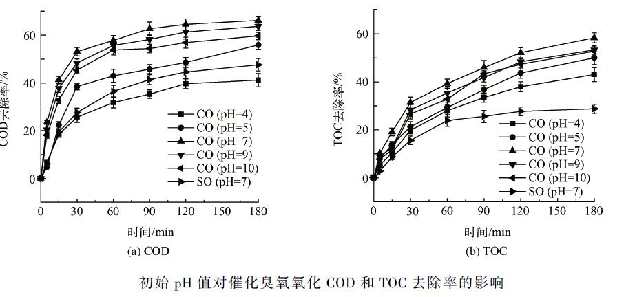 由圖1可知,催化臭氧氧化(catalytic ozonation,CO)的COD 去除率可以達到(66. 2 ± 1. 7)% ,比單獨臭氧氧化(single ozonation,SO) 的(47. 6 ± 2. 6)% 提高了近20 個百分點;而TOC 去除率則可以達到(58. 4 ± 2. 1)% ,比單獨臭氧氧化的(28. 8 ± 1. 9)% 提高了近1 倍。調(diào)節(jié)廢水pH 值,無論是酸性(pH = 4,5),還是堿性(pH = 9,10),催化臭氧氧化的效果都不如中性(pH = 7)的效果好,這可能是因為羥基氧化鐵的零電荷點(pHpzc )在中性附近,過酸和過堿都影響了羥基氧化鐵表面羥基的電荷形態(tài)。需要注意的是:當(dāng)pH = 4 時,COD 的去除率不如單獨氧化的,但TOC 的去除率卻比單獨氧化的高。這是因為單獨臭氧氧化很難降解煤化工生化出水中的難降解有機物,從而TOC去除率低;而pH = 4 時催化臭氧氧化一定程度上降解了這部分難降解有機物,甚至是難以測出COD 的有機物,但效果沒有中性和堿性條件下的好,依然有一部分降解不完全,反而被檢測出COD,從而COD 的去除率反而降低。