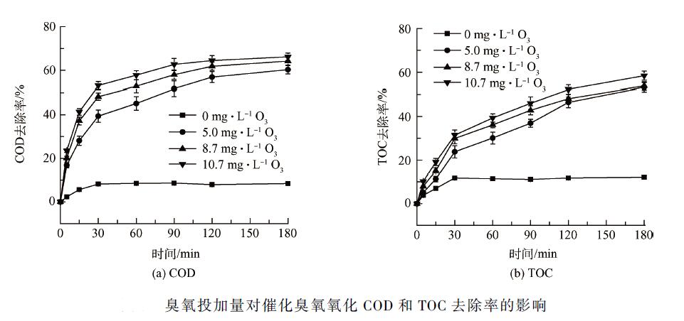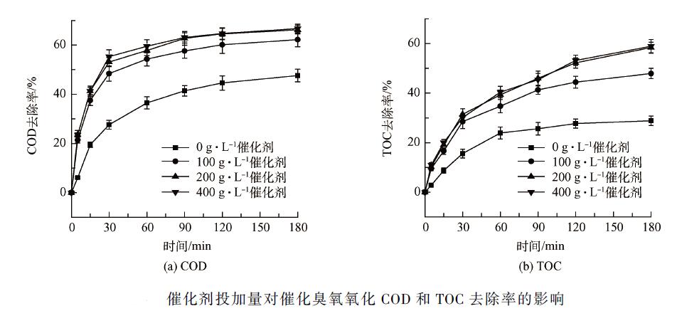 臭氧是有機物降解的直接動力,其投加量直接影響催化臭氧氧化的速率及效果。實驗通過調(diào)節(jié)所用臭氧發(fā)生器電流檔位改變臭氧投加量,并用碘量法測出臭氧產(chǎn)生量。廢水不調(diào)節(jié)pH 值(中性),催化劑投加量為200 g·L - 1 。由圖3 可知,不通臭氧,單純通空氣時,催化劑對廢水只有吸附作用,此時COD 和TOC 的去除率僅有(8. 6 ± 0. 3)% 和(12. 1 ± 0. 4)% 。增大臭氧投加量對COD 和TOC 的去除率的提有限,這可能與臭氧的利用率有關(guān),有效利用的臭氧較少,但增大臭氧投加量,有利于三相界面的傳質(zhì),反應(yīng)速率更快,特別是在短時間內(nèi)效果顯著。
