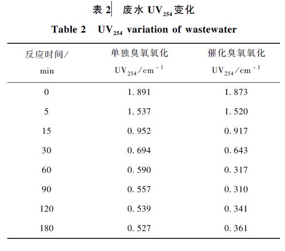 由表2 可知,單獨臭氧氧化對廢水UV254 的去除率為72. 1% ,催化臭氧氧化對廢水UV254 的去除率為80. 7% ,催化臭氧氧化的處理效果優(yōu)于單獨臭氧氧化。