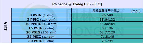 將水壓輸入溶解度計算為P.水壓力計算為大氣壓。0 psig = 1大氣壓= 14.7 psia。隨著對水的壓力增加,臭氧的溶解度增加。上表和下表是基于臭氧濃度為6重量%(85.8g / m 3)和15℃水溫的該計算的實例。這些是許多臭氧應用的非常平均值。