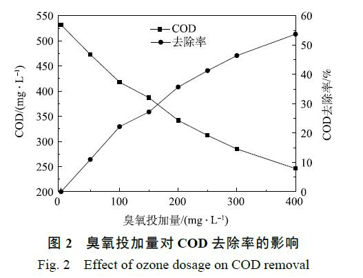 實(shí)驗(yàn)選取了 4 個(gè)不同的 pH,用 NaOH 調(diào)節(jié)廢水 pH,臭氧催化氧化時(shí)間為 60 min,臭氧的投加量為 300 mg·L−1。由 圖 4 可知,初 始 pH 對(duì)臭氧催化氧化降 解COD 的影響較大,隨著 pH 的升高,COD 的去除率呈上升趨勢(shì),當(dāng)初始 pH 從 5 升到 9 時(shí),COD 的去除率從 46.4% 升至 52.1%。臭氧間接氧化較多發(fā)生在中、堿性條件下,臭氧在堿性條件下很不穩(wěn)定,易促進(jìn)其自身分解[18],可通過(guò)自發(fā)的一系列鏈?zhǔn)椒磻?yīng)生成強(qiáng)氧化性的·OH[19],更有利于 COD 的去除。此外隨著廢水pH 的升高,水中 OH−濃度增加,加劇了臭氧分解產(chǎn)生·OH。