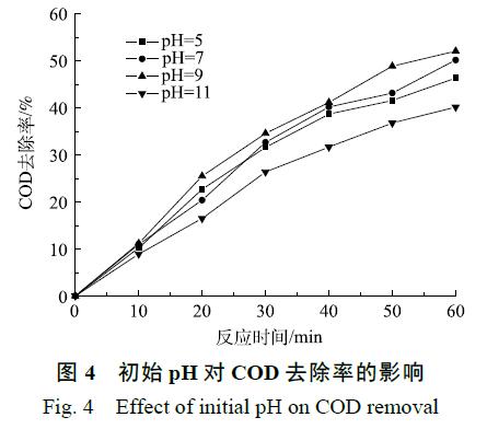 當(dāng)廢水 pH 進(jìn)一步升高至 11 時(shí),COD 的去除率下降至 40.2%,這可能是因?yàn)槌粞醮呋瘎┑牧汶姾牲c(diǎn) 在 pH=9 附近,酸性或過(guò)堿性條件都影響了催化劑表面羥基的電荷形態(tài)[20]。此外,由于 pH 的升高,導(dǎo)致羥基自由基的淬滅速率提高,降低了與有機(jī)物的接觸概率,導(dǎo)致 COD 去除率的降低[21]。