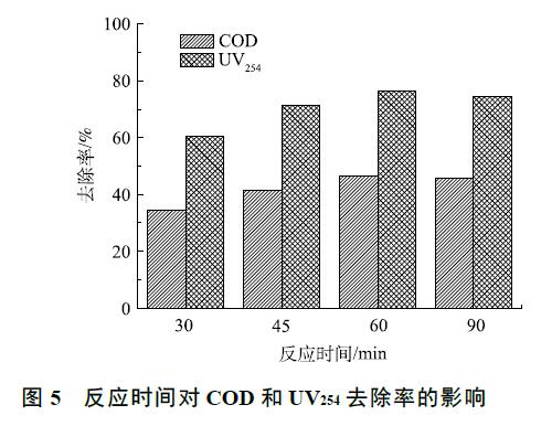 臭氧催化氧化實(shí)驗(yàn)在室溫下進(jìn)行,在廢水初始 pH 為 5,通過(guò)調(diào)節(jié)臭氧進(jìn)氣濃度控制臭氧投加量為 300 mg·L−1 的條件下,考察了臭氧催化氧化時(shí)間對(duì)有機(jī)物去除效果的影響,結(jié)果如圖 5 所示。當(dāng)反應(yīng)時(shí)間從 30 min 增至 60 min 時(shí),COD 和 UV254 的去除率分別從 34.6%、60.4% 升高到 46.4%、76.3%,有機(jī)物的去除率隨反應(yīng)時(shí)間的延遲而增加。這是由于·OH 在水中的壽命很短 [22],大約 為 10−9 s,臭氧催化氧化中·OH 氧化反應(yīng)實(shí)際發(fā)生在催化劑周?chē)趥髻|(zhì)不充分的反應(yīng)條件下,部分·OH 在未知有機(jī)物發(fā)生反應(yīng)之前就已經(jīng)被淬滅。當(dāng)臭氧催化氧化時(shí)間縮短時(shí),單位時(shí)間內(nèi)臭氧投加量加大,產(chǎn)生的·OH 增多,導(dǎo)致大量·OH 未參與反應(yīng)就淬滅,從而導(dǎo)致有機(jī)物去除率下降。當(dāng)反應(yīng)時(shí)間到達(dá)一定的臨界點(diǎn)時(shí),再延長(zhǎng)反應(yīng)時(shí)間,其去除率增加不再明顯,臭氧催化氧化反應(yīng)從 60 min延長(zhǎng)至 90 min 時(shí),COD 和 UV254 的去除率基本不變。