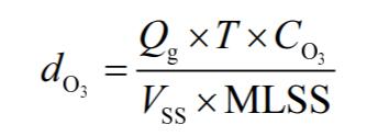 本試驗的臭氧投加量定義為臭氧投量與初始污泥量的比值,其計算方式如下: