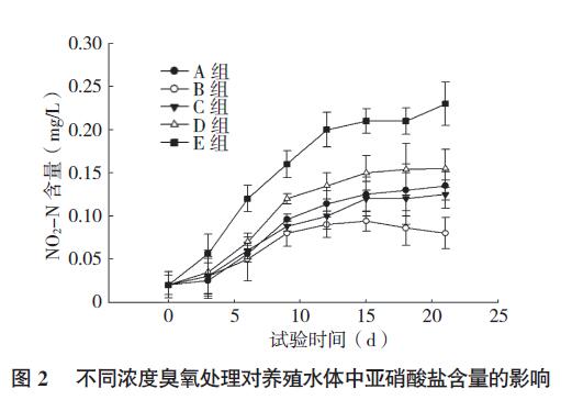 由圖1、圖2 可知,各組水體氨氮和亞硝酸鹽含量都呈上升趨勢。與對照組(E 組)相比,經過臭氧處理水體中的氨氮和亞硝酸鹽含量上升緩慢,可見臭氧對水體中的氨氮和亞硝酸有明顯的降解效果。B 組(0.1 mg/L 臭氧)水體的氨氮和亞硝酸鹽含量顯著低于其他幾組,而A 組(0.05 mg/L 臭氧)水體的氨氮含量和亞硝酸鹽含量雖然與C 組(0.15 mg/L 臭氧)相比差異不顯著,但高于C 組。可見,較低濃度臭氧對水體中氨氮和亞硝酸鹽降解效果不顯著,但其濃度也不是越高越好。