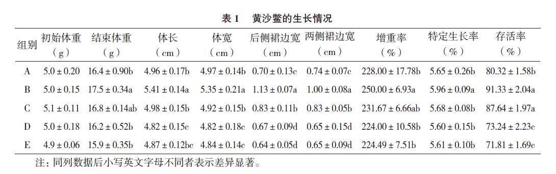 試驗期間,每隔3 d 從池中取樣測量水質,測定其溶解氧、氨氮含量、亞硝酸鹽含量,試驗周期為21 d。試驗結束時,統計各組黃沙鱉的存活數量。并隨機從水池中取出10 只黃沙鱉,測量其體重、體長、體寬、裙邊寬度,其中后側裙邊寬度為背甲 很長線上背甲邊到裙邊邊緣的距離;兩側裙邊寬度為背甲 很寬線上背甲邊到裙邊邊緣的距離。