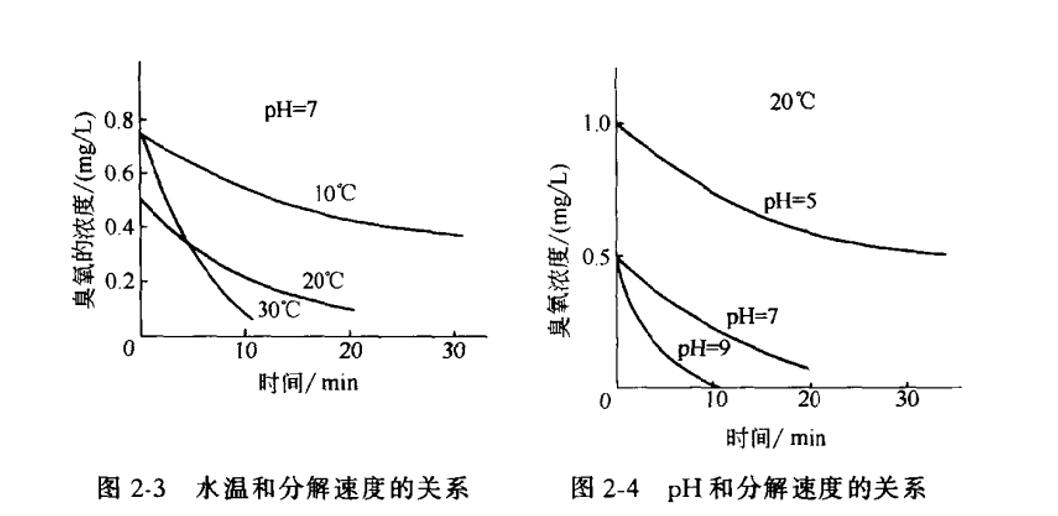 臭氧在水中的分解速度隨水溫和pH值的提高而加快,圖2-3為pH=7時(shí),水溫和分解速度的關(guān)系,圖2-4為20℃時(shí),pH和分解速度的關(guān)系。