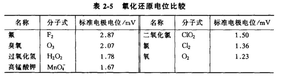 從表2-5可知,臭氧的標(biāo)準(zhǔn)電極電位除比氟低之外,比氧、氯、二氧化氯及高錳酸鉀等氧化劑都高。說(shuō)明臭氧是常用氧化劑中氧化能力 很強(qiáng)的。同時(shí),臭氧反應(yīng)后的生成物是氧氣,所以臭氧是高效的無(wú)二次污染的氧化劑。